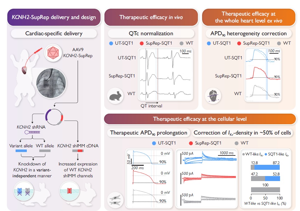 Type 1 short QT syndrome (SQT1) is a genetic channelopathy caused by gain-of-function variants in KCNH2, resulting in shortened cardiac repolarization and QT intervals, which predispose patients to ventricular arrhythmias and sudden cardiac death. In our study published in the European Heart Journal, we investigated the therapeutic efficacy of a novel KCNH2-specific suppression-and-replacement (KCNH2- SupRep) gene therapy in our transgenic rabbit model of SQT1. We could demonstrate that KCNH2-SupRep corrects the disease phenotype on all levels, e.g., normalized the QT without increasing repolarization heterogeneity in vivo, resolves apicobasal APD heterogeneity in the whole heart, suggesting an antiarrhythmic effect confirmed by reduced re-entry-mediated arrhythmogenesis in silico. At the cellular levels, it prolongs APD, partially normalizes the ion current IKr, and restores electro-mechanical interplay. In sum, this study is the first to demonstrate the efficacy of gene therapy in restoring the physiological phenotype in a medium-sized animal model of SQT1, highlighting its potential for future clinical application.